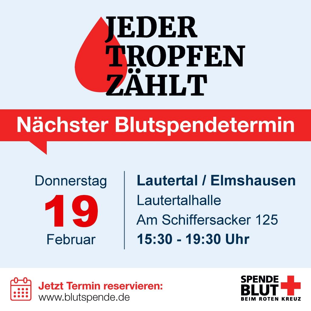 Wo? Lautertalhalle ElmshausenWann? Donnerstag, 19. Februar 2026Uhrzeit? 15:30 – 19:30 Uhr Auch 2026 veranstalten wir wieder mehrere Blutspendetermine. Der erste Termin findet schon am 19. Februar ab 15:30 Uhr in der Lautertalhalle in Elmshausen statt. Und dieses Mal gibt es gleich zwei Vorteile, bei uns vorbeizuschauen. 1. Für Erstspendende...